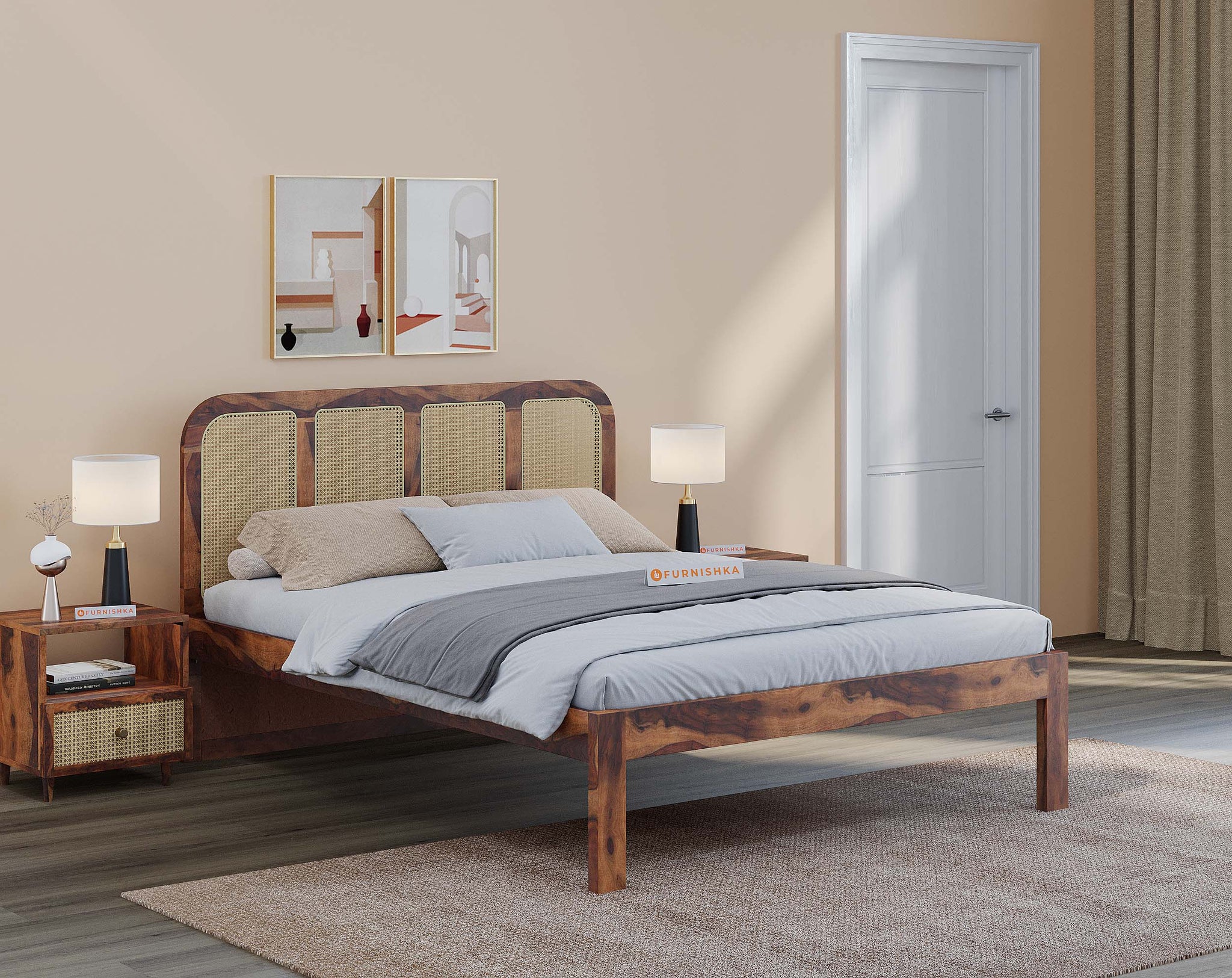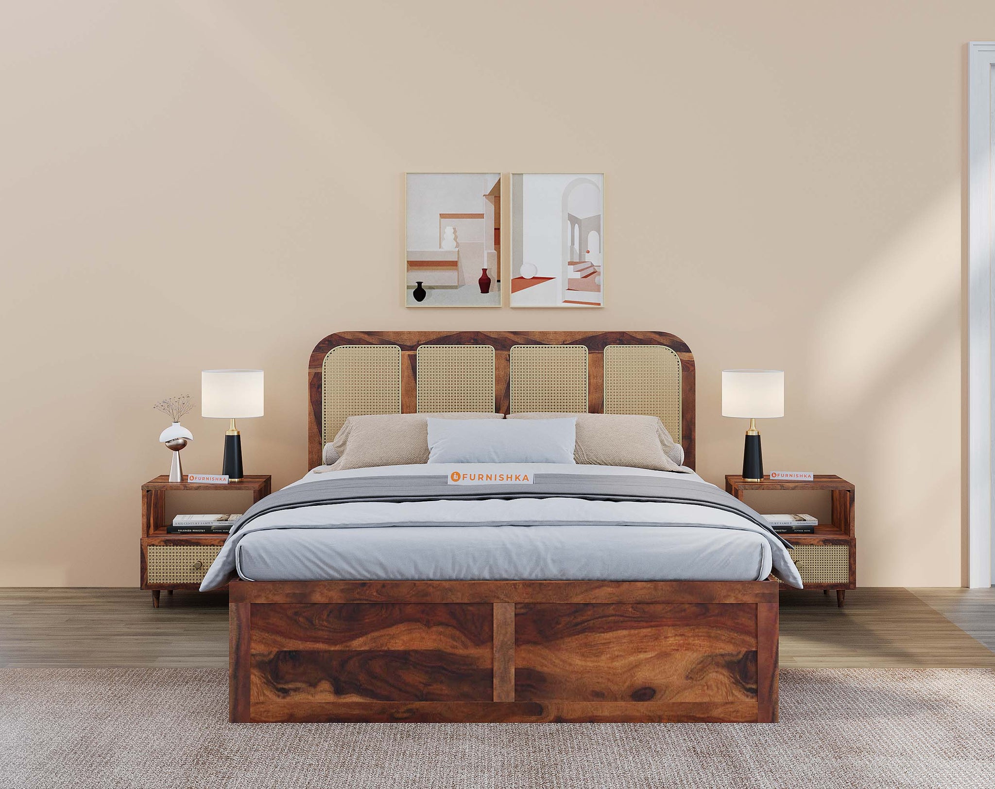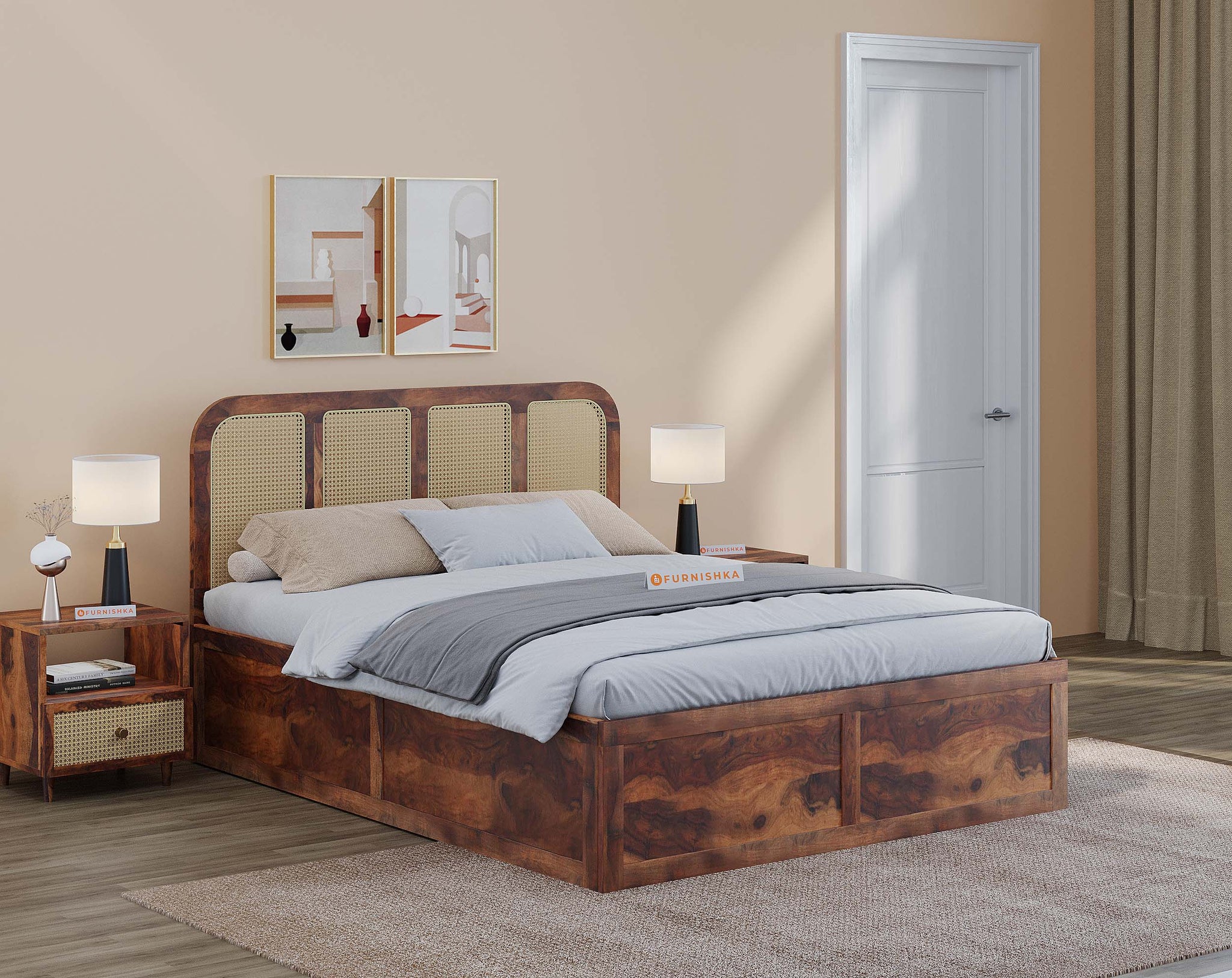 The Amara Bed features a minimal design with breathable cane accents, crafted from real sheesham wood. Designed for restful sleep, it is available in king and queen sizes with storage options.