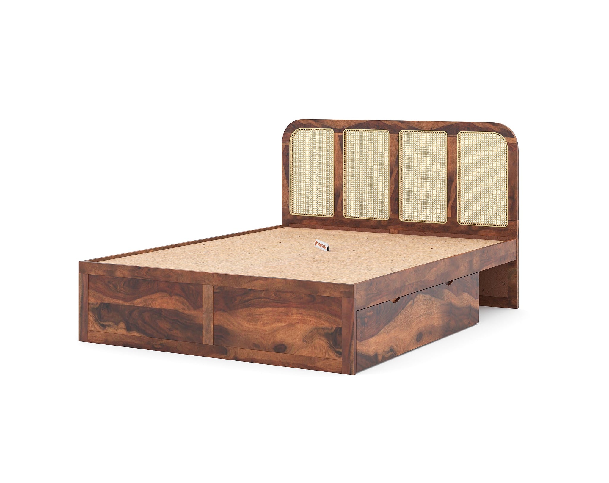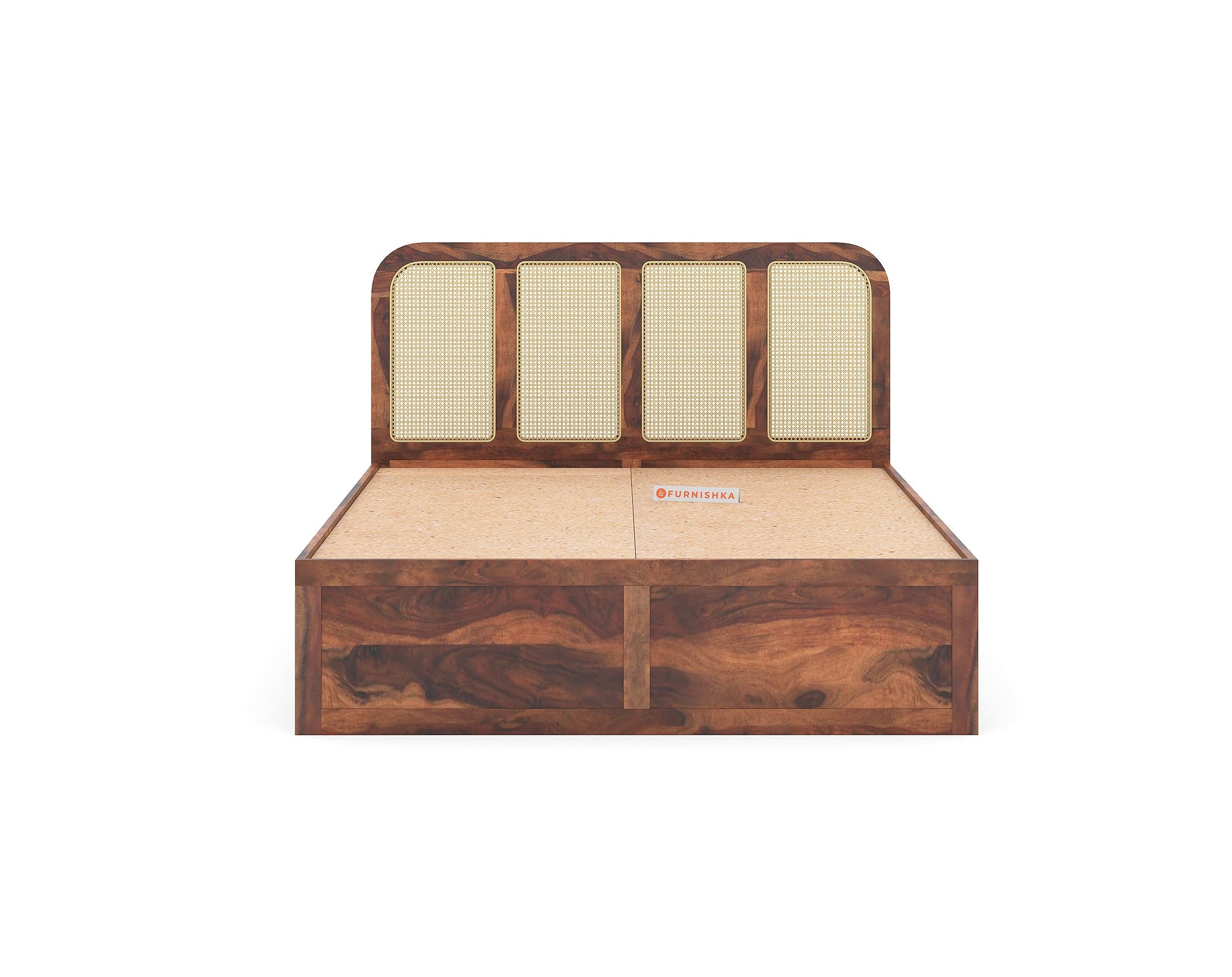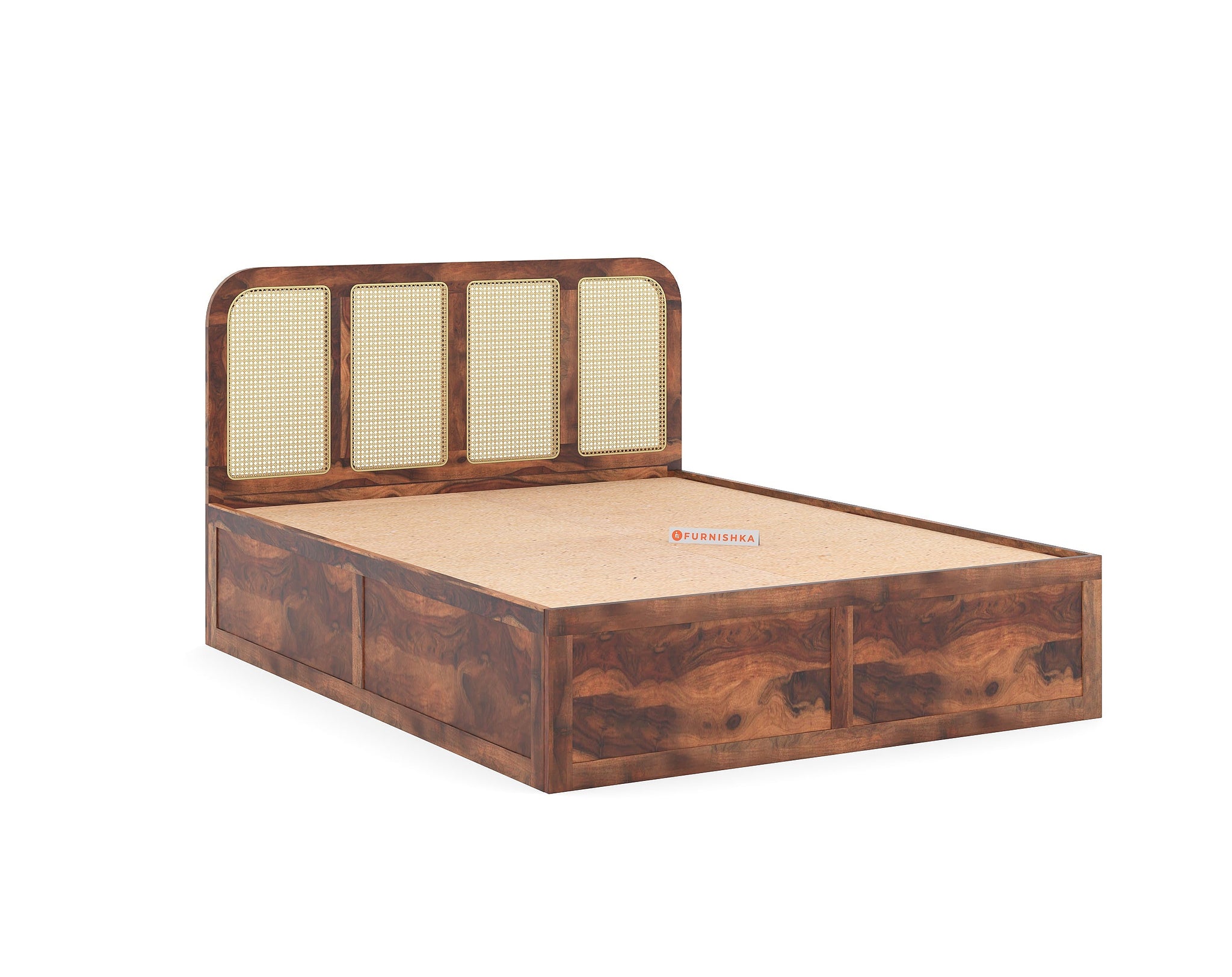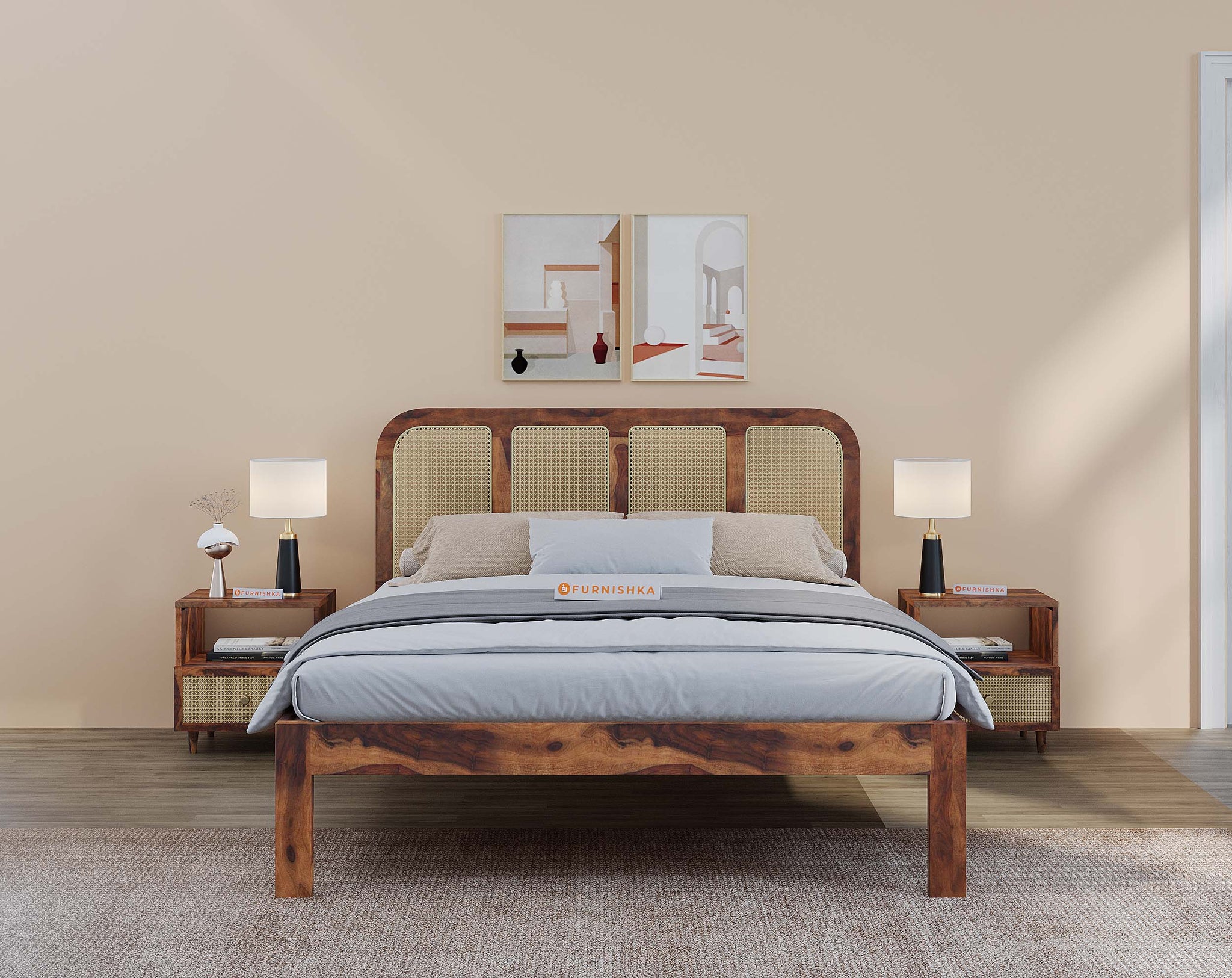 The Amara Bed features a minimal design with breathable cane accents, crafted from real sheesham wood. Designed for restful sleep, it is available in king and queen sizes with storage options.