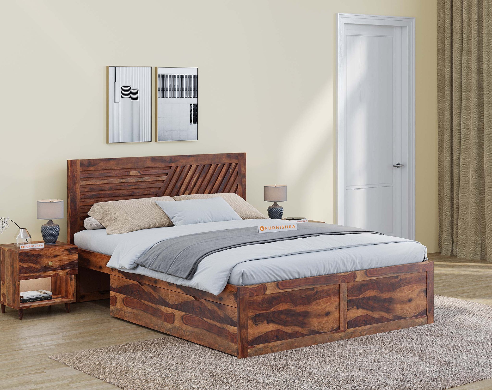 The Stella Bed features a sturdy real Sheesham wood frame with a slatted headboard. Available in king-size and queen-size bed options, it has a choice of drawer, hydraulic, or box storage.